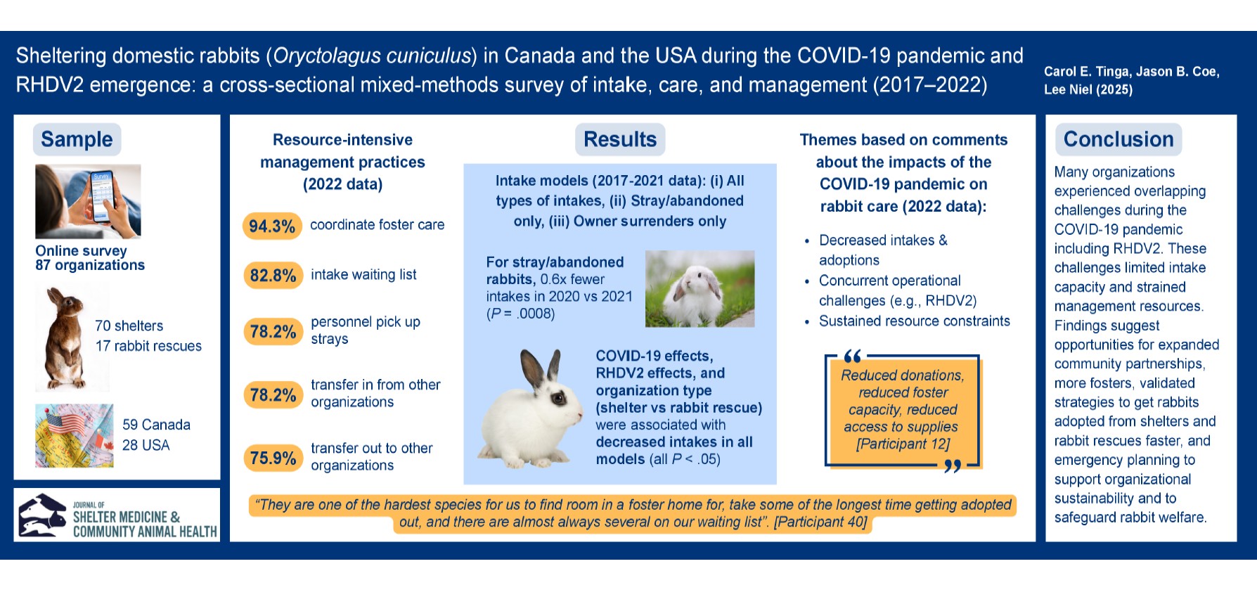 Conclusion: Some organizations faced complex, simultaneous challenges during the COVID-19 pandemic and RHDV2 emergence, significantly limiting intakes and straining resources. Recommendations include emergency planning, expanded fostering, and community partnerships to support sustainability and to safeguard rabbit welfare.
